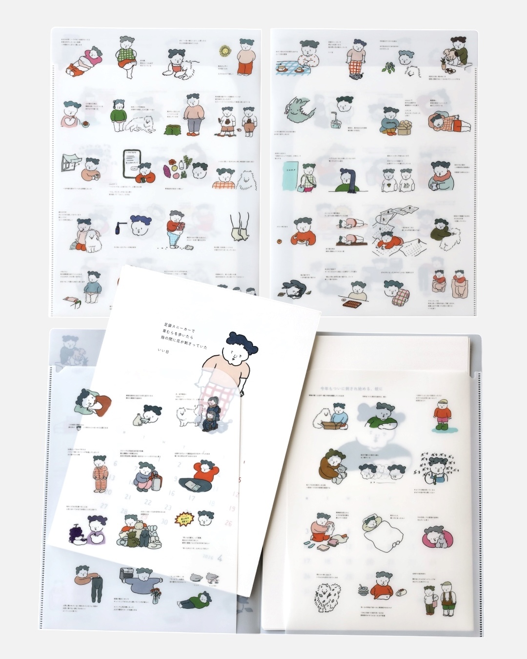 「本日のどうでもよいこと」が4面にたっぷり詰まった、見開きWポケット型のクリアファイルです。しっかりと厚みがある上、マット素材で指紋もつかないのがポイントです。