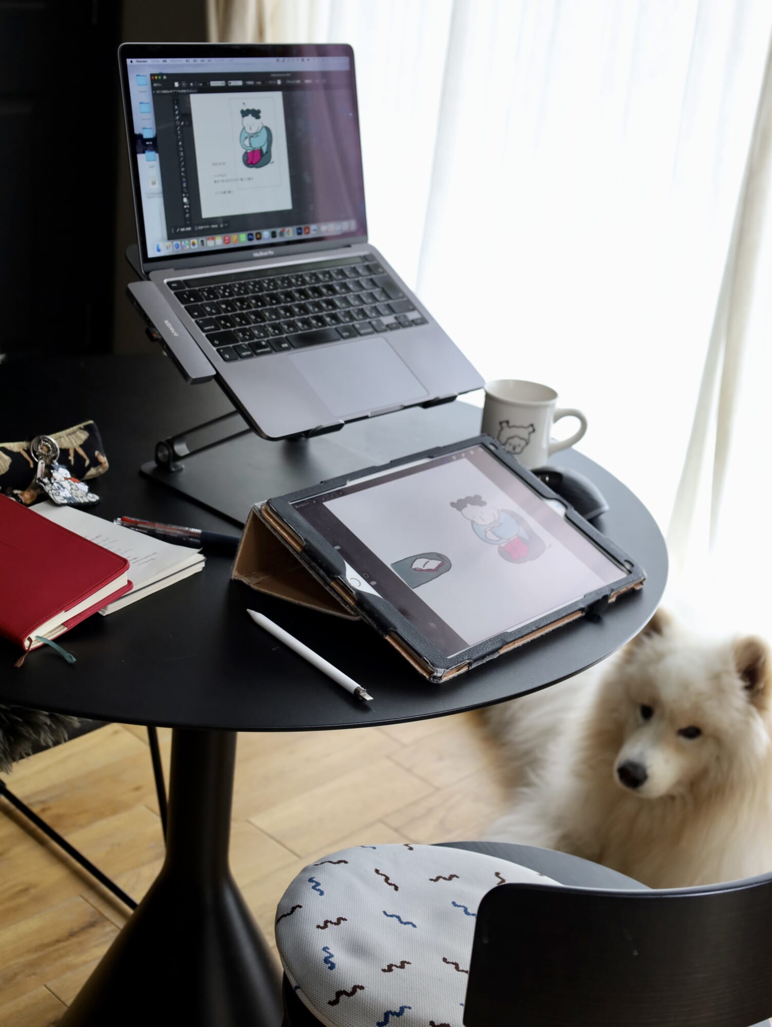生活と仕事はグラデーションでどこまでも繋がっているので、常に住環境を整えること、マインド面の風通しを良くすることを意識して過ごしています。始業前の朝のルーティンとして、家の中を整えること、目に入るところにお気に入りのものを置くこと、犬と散歩に行くこと、いつもごきげんでいること、たくさんの情報を追わないことなど……。「本日のどうでもよいこと」含め、日常の中での気づきやふと思ったことがイラストの種になることが多いので、生活は大切にしています。