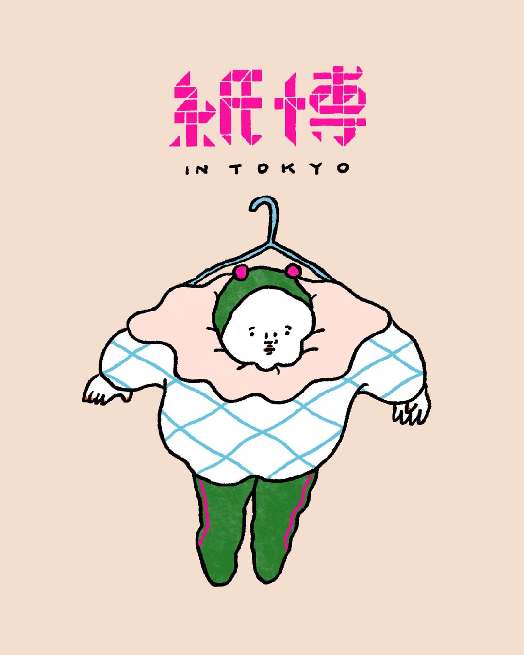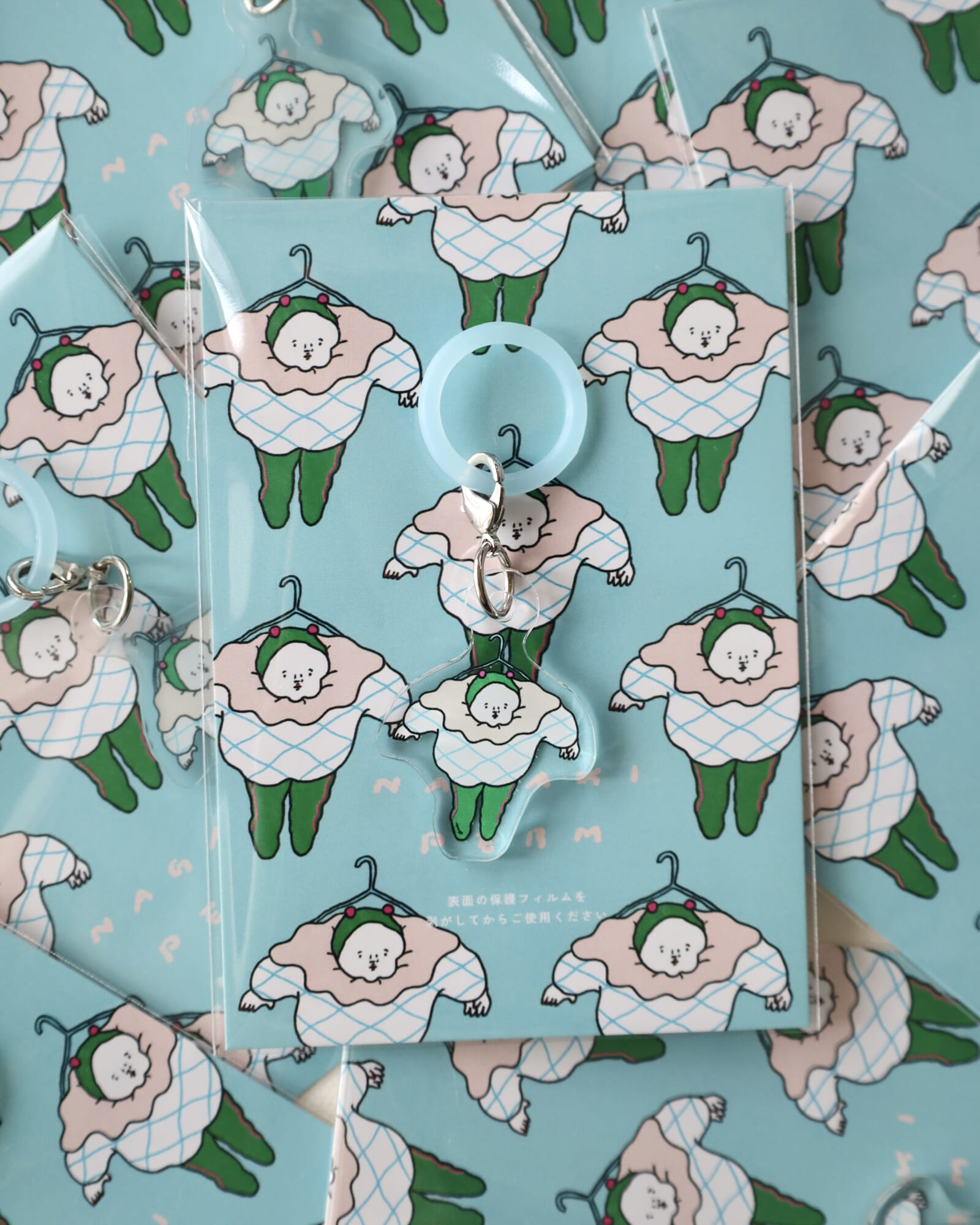 例えば、「紙博 in 東京 vol.12」限定で販売した「ハンガーに吊られている人」というタイトルのアクリルチャーム。あれは人間がハンガーに吊られている状況に赤ちゃん用のツノがついた帽子を掛け合わせることで、絶妙さが生まれたと思っています。これは自分の子どもがツノ帽子をピタッと被ったフォルムが好きで、これを絶対に描きたいと思って採用しました(笑)