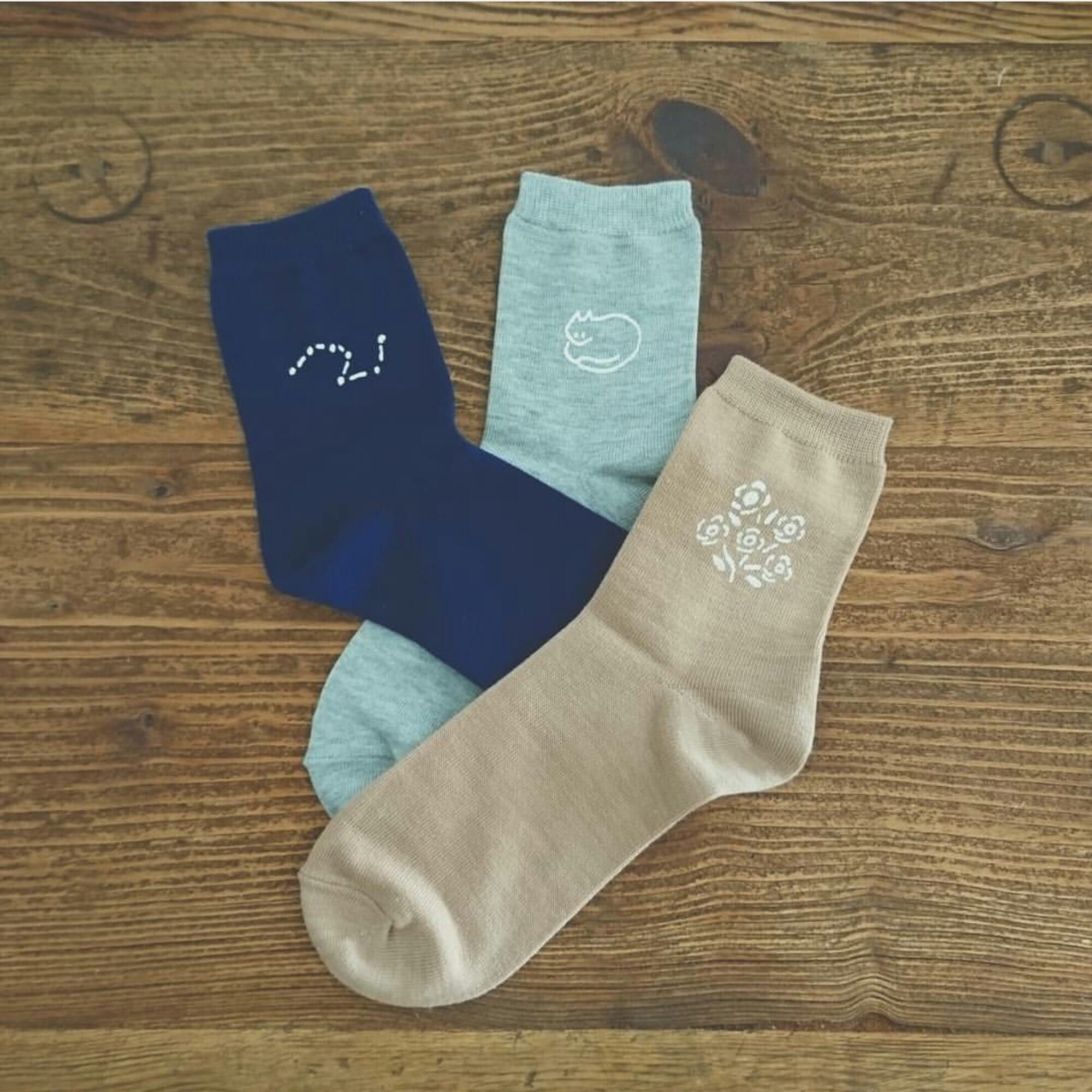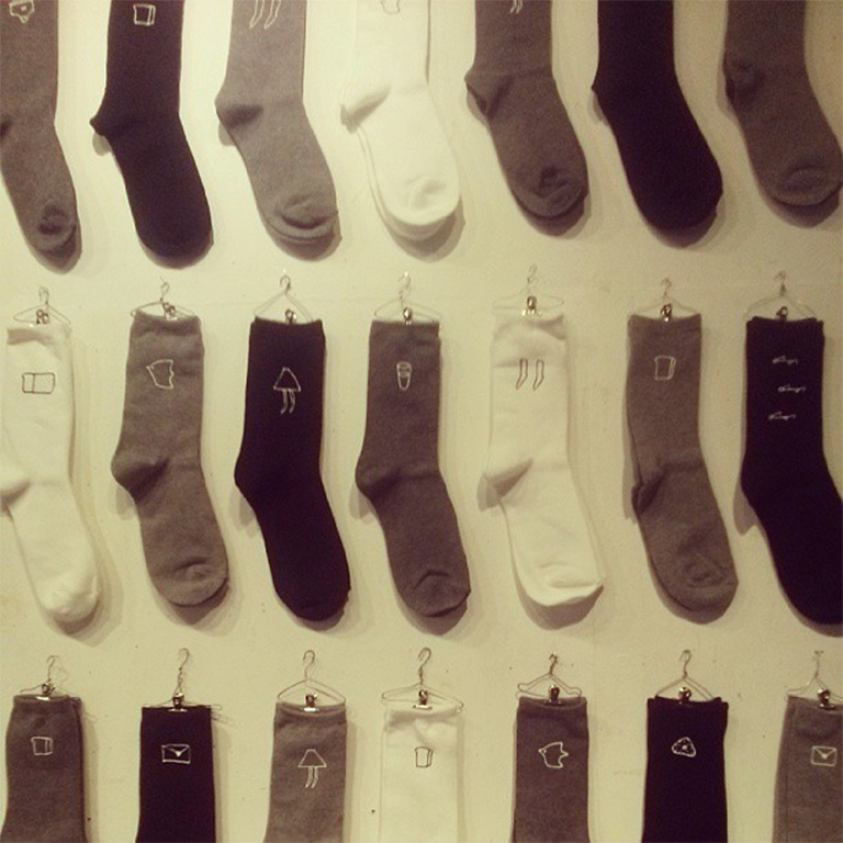 活動を始めて4〜5年目くらいまでは、トートバッグや靴下を買ってきて、手描きで直接イラストを入れるような作り方もしていました。イベント直前になると、イラストを描いた靴下を乾かす場所がなくって、ふとんの半分くらいのスペースを靴下に取られていました(笑)