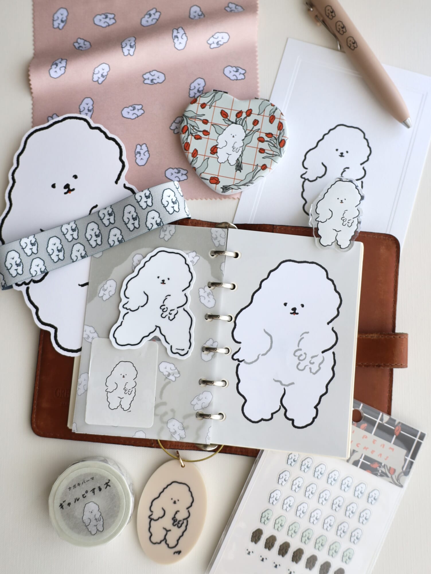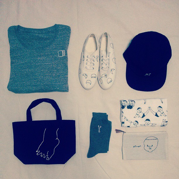 ポーチやノートなど、バッグの中に入るものにはキャラクターの顔のイラストを大胆に使い、外から見えるアパレルアイテムなどは極力普段使いしやすいデザインにしたいと思っています。私自身も、キャラクターの顔が外から見える位置に大きくデザインされたグッズをあまり使わないですね。でも、お客さんは「ナガキパーマさんが描いたキャラクターの顔が入っているから買ってます!」と言ってくれることも多く、オシャレに使いこなしてくださっていたりするととても嬉しいです。アパレルアイテムへのイラストの落とし込み方の良い塩梅がだんだんわかってきた気がします。