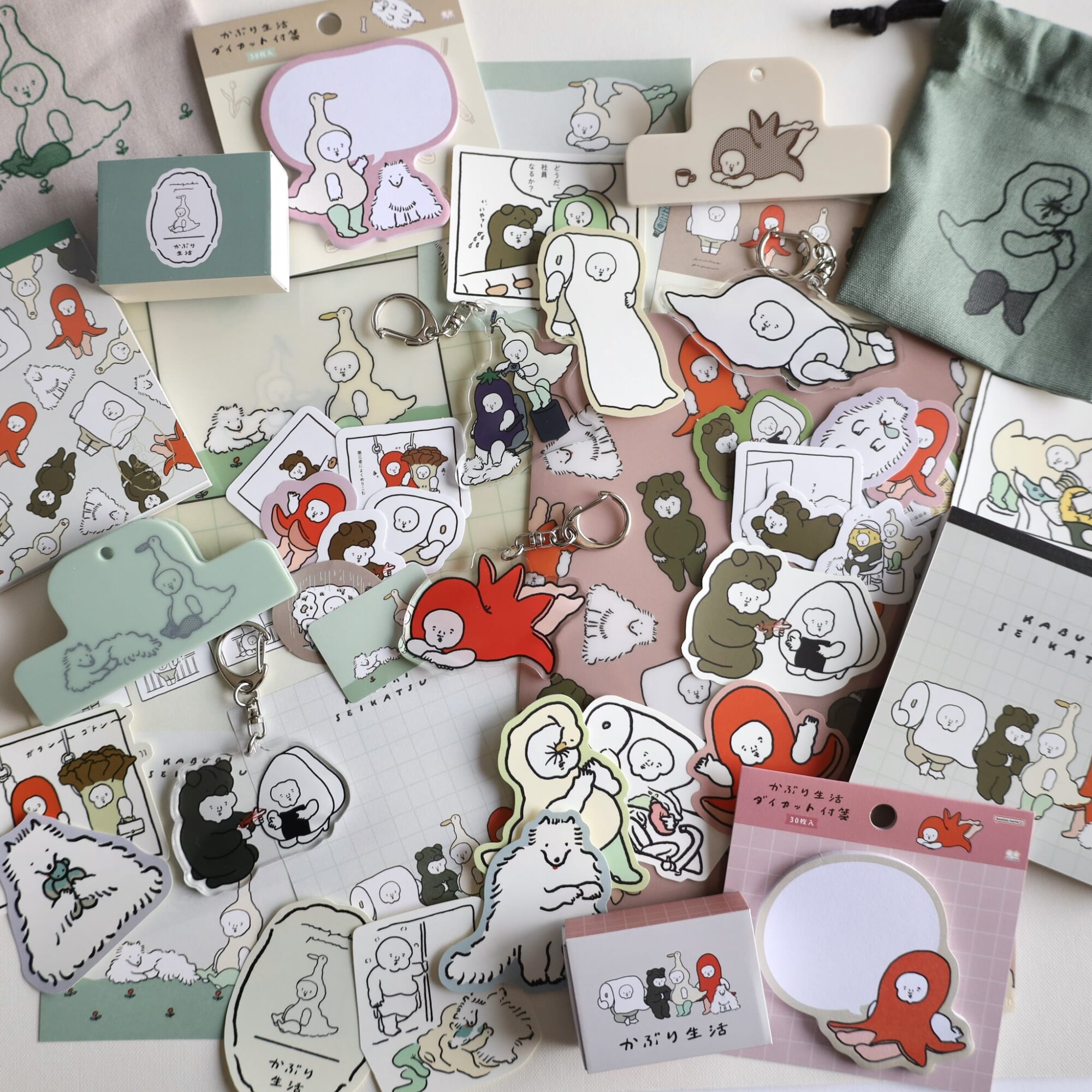 「かぶり生活」に出てくるキャラクター達はみんな社会人なんです。たこさんウインナーは商社の営業だし、くまはアパート経営だし、アヒルは「ナガキ美容院」の美容師です(笑) 代々家系で決められたかぶりものをかぶって生きていくとか、背景の設定も細かく決めています。ナガキパーマのグッズに使われているキャラクターのうちの1つとしてではなく、背景設定も含めて「かぶり生活」という名前で多くの人に知ってもらえれば良いなという気持ちで作りました。