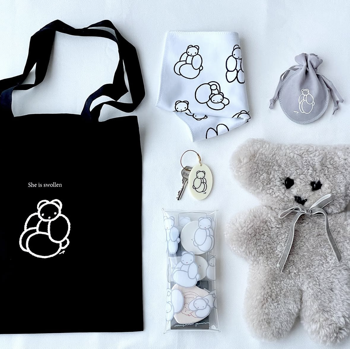 おもむろにパツンパツンの白いくまを描いた時に「これは見るからにむくんでいる」と思って……。それで「無垢河原浮腫(むくがわらムクミ)」っていうふざけた名前を付けたのが始まりです。最初はイラストをストーリーにアップしただけだったんですが、それを見てくれた人からムクミに対してかなり良い反応をいただけたので、そこから少しずつキャラクターとしてグッズ化していきました。ナガキパーマ史上初めて名前を持ったキャラクターです。