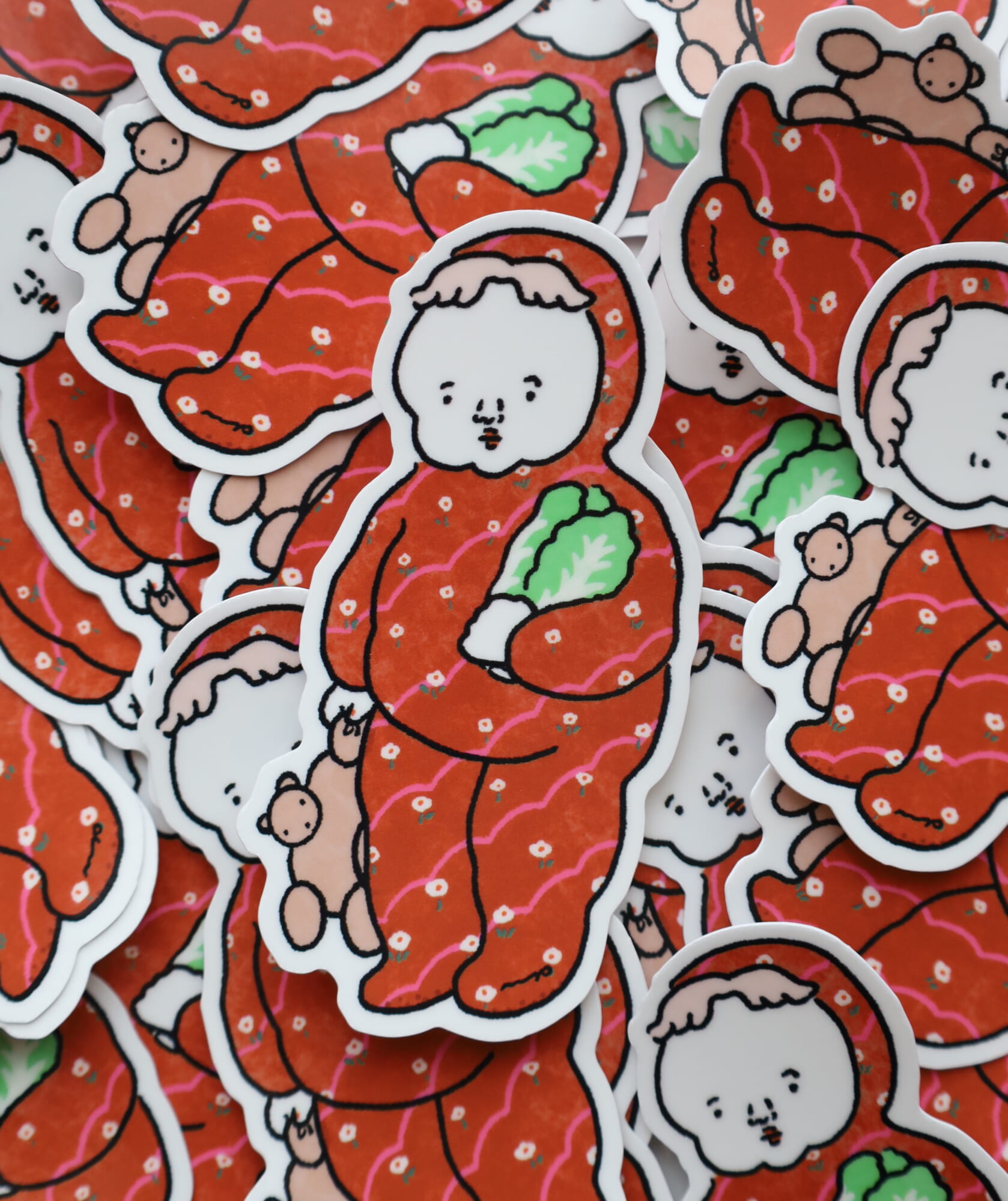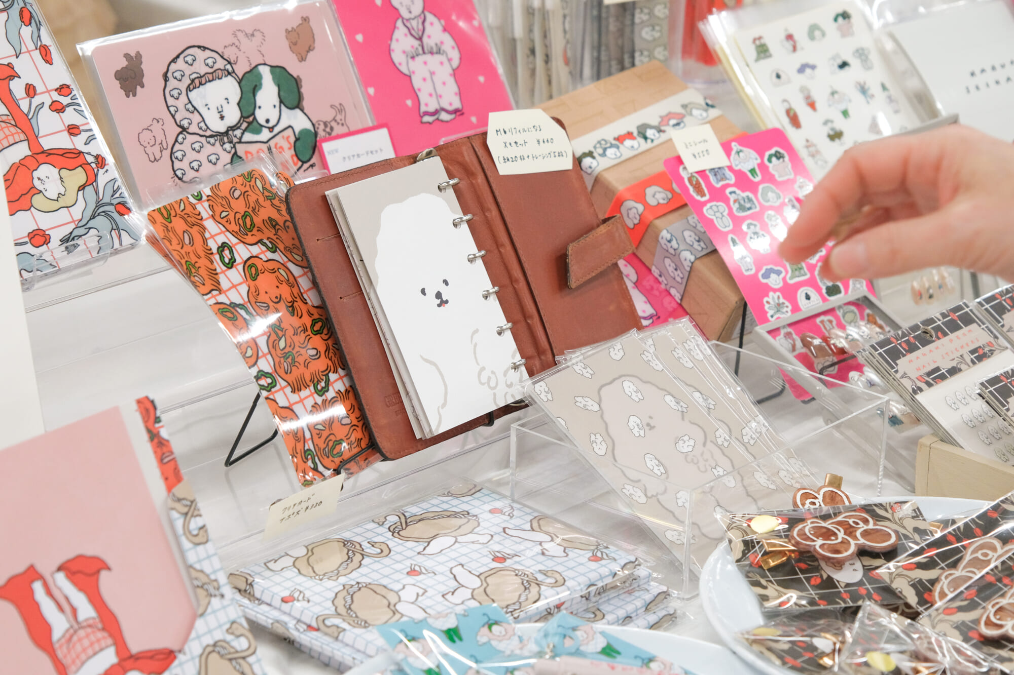 イベントに向けて、大体3〜4ヶ月前には何を作るのかを決めています。すでに販売しているグッズの新柄を作るのか、新しいものにチャレンジするのか……。それが決まったら、どのイラストを使うのかを考えます。過去に描いたイラストのストックが溜まっているので、そこから引っ張ってきたり、直近で開催したPOPUPのメインビジュアルから持ってきて組み合わせたりして。ステッカーは描き下ろしイラストで作ることが多いので、特に人気のあった絵柄からほかのグッズを作ることもあります。