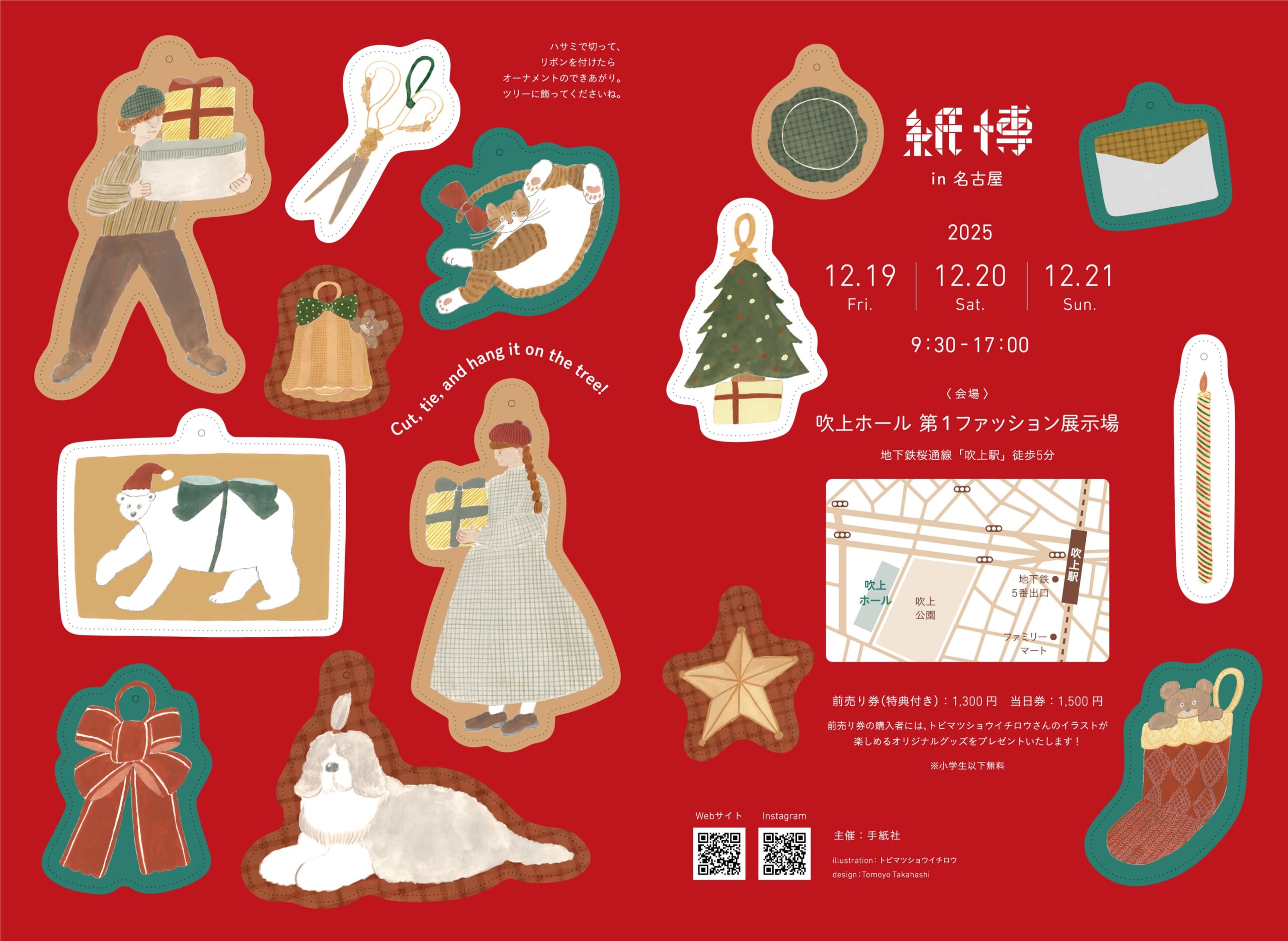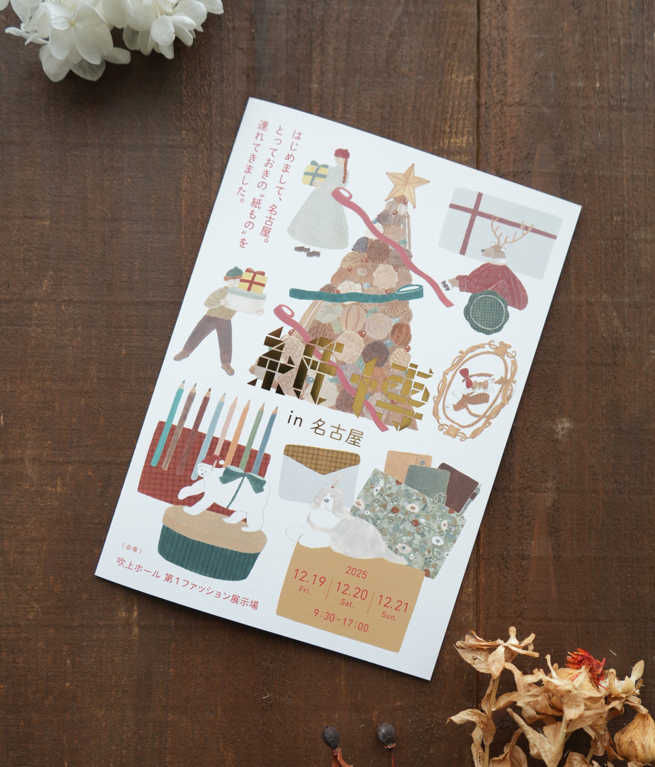 トビマツショウイチロウさんのイラストがたっぷりと楽しめる「紙博 in 名古屋」のフライヤーが完成しました! 箔押しのロゴがキラッと輝く表紙をめくると、クリスマス支度を楽しむ子どもたちや動物たちがお出迎え。イラストを切り取れば、そのままオーナメントにすることができますよ。他にも、出展者情報やお楽しみコンテンツなど、紙博が楽しみになる情報が盛りだくさん! どこかでフライヤーを見つけたら、ぜひお手に取ってご覧くださいね。