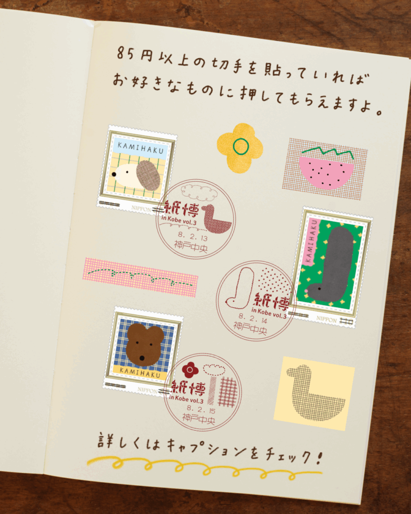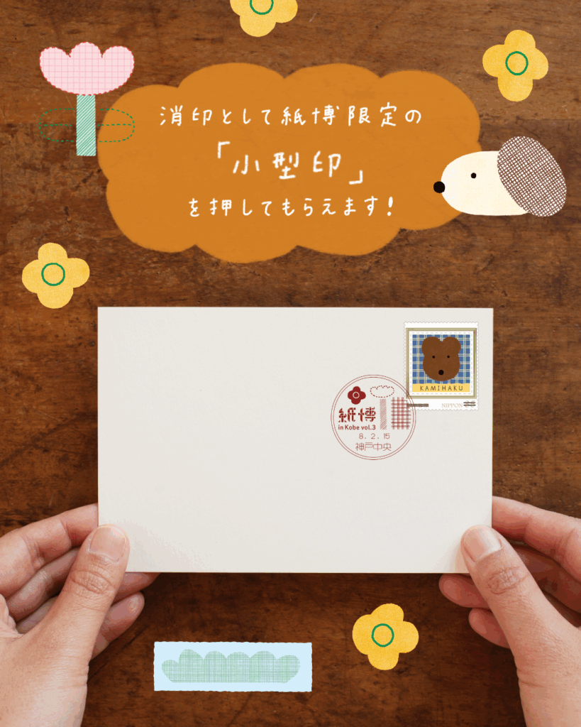 神戸中央郵便局の協力のもと、3日間限定で「紙博郵便局」が出現! なんと、紙博の会場から実際にお手紙やハガキを郵便に出すことができますよ。さらに今回は、特別に消印としてしまむらひかりさんが手がけてくれた「小型印(期間限定で押印できる絵入りの消印)」を押印してもらえます!