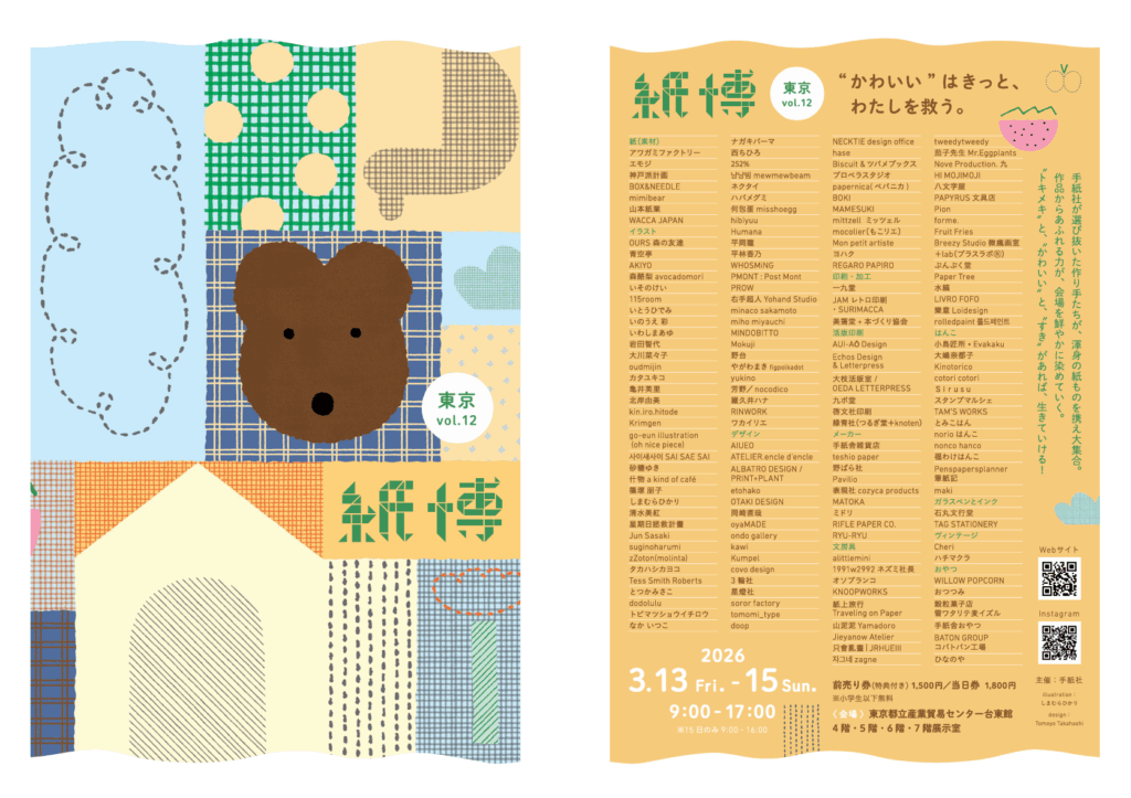 しまむらひかり(@shimamura_hikari)さんのイラストをたっぷりと楽しめる「紙博 in 東京 vol.12」のフライヤーを配布中! “パッチワーク”をテーマに描かれたメインビジュアルは、パステルカラーのやわらかな色使いと、愛らしいモチーフの組み合わせがなんともキュート。思わずじっと眺めたくなる一枚に仕上がりました。裏面では、東京に集う160組以上の作り手を一覧でチェックできますよ。さらに今回のフライヤーは、「紙博 in 神戸 vol.3」のフライヤーとつながる仕掛けもありますよ。どこかで見かけたら、ぜひお手に取ってご覧くださいね。