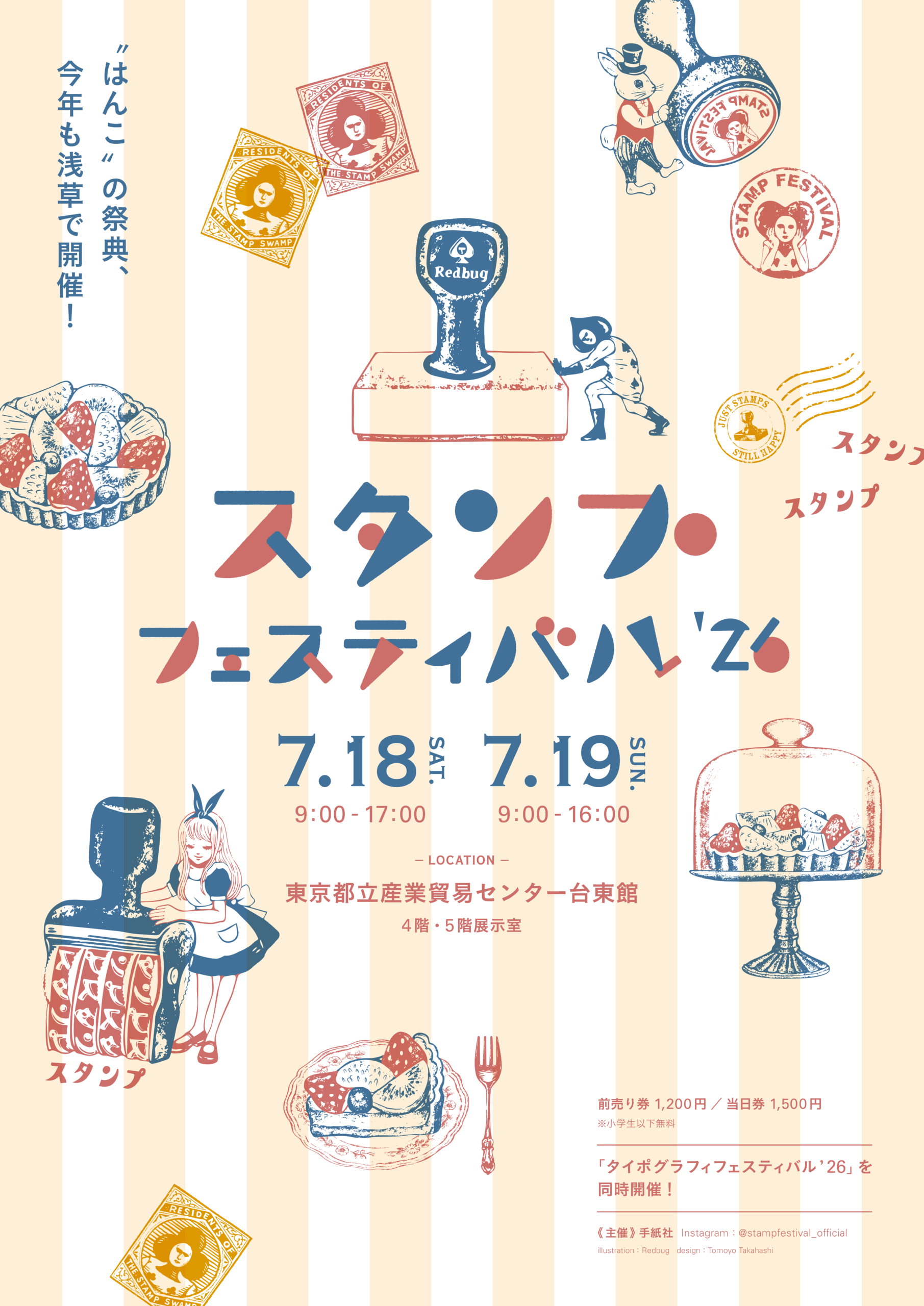 そして、この「スタンプフェスティバル’26」を彩るメインビジュアルを手がけてくれたのは、第1回の開催時に常に人だかりの絶えないブースで注目された、オリジナルデザインのラバースタンプを制作するはんこ作家・Redbugさん。美味しそうなスイーツのはんこや、はんこで遊ぶトランプの兵隊やうさぎが、コミカルで可愛らしいデザインです。どんなコラボグッズが誕生するのか、乞うご期待!