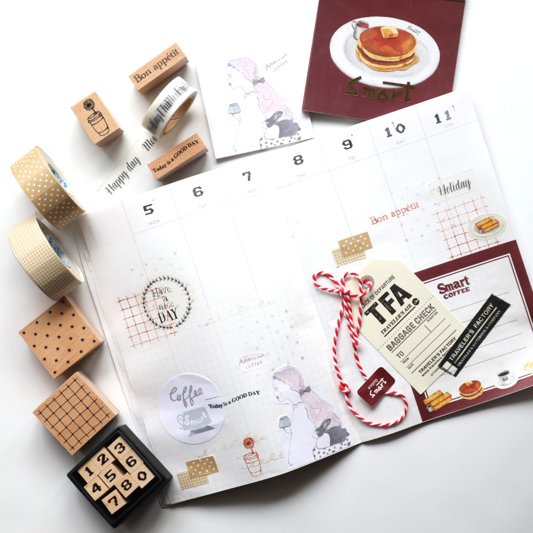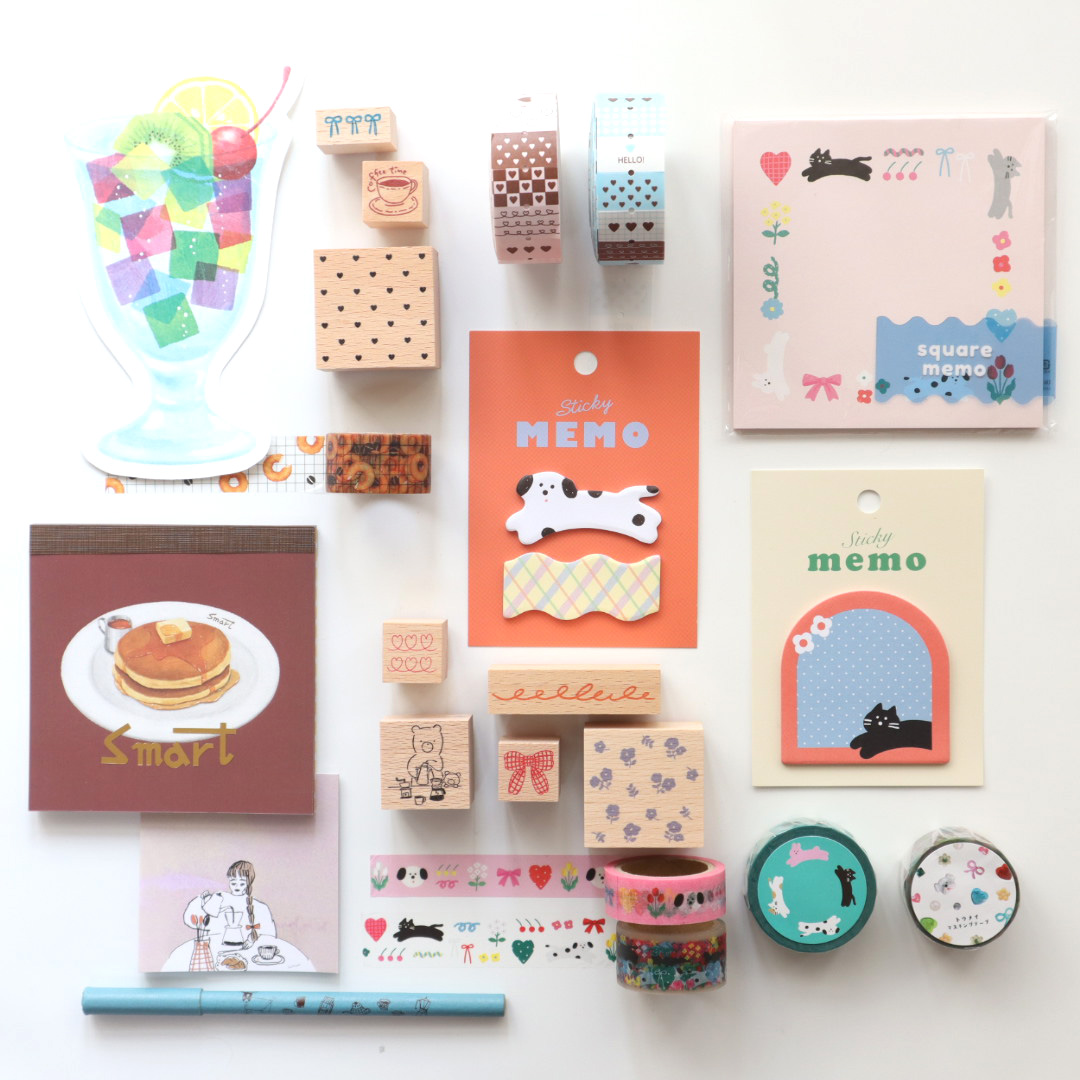 メモ帳、マスキングテープ、付箋、スタンプ、ラベラーロールシールなど。