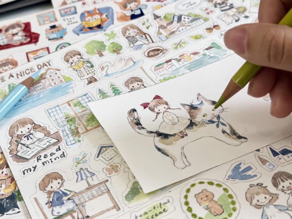 子供の頃から文房具が大好きで、放課後はよく文房具屋さんで長い時間ぶらぶらしていました。手帳をつけ始めてからは、自分の手帳に小さなイラストを描いてネットに投稿し、皆から褒めてもらったことから、自分専用の文房具も作れるかもしれないと思い、2012年から様々なシールやマスキングテープを描き始めました。