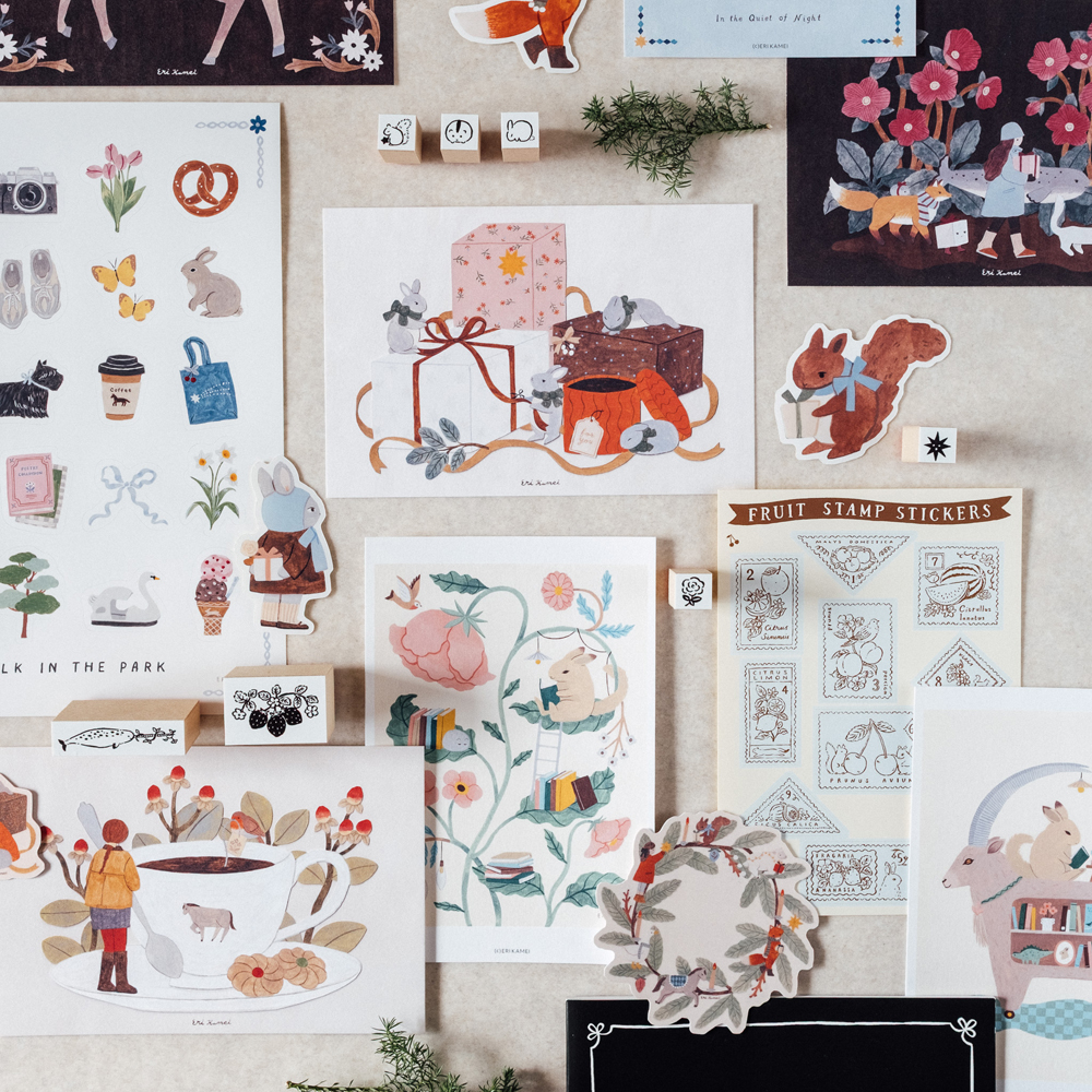兵庫県出身、東京都在住。武蔵野美術大学デザイン情報学科に進学し、在学中からイラストレーションの制作を始めた亀井英里さん。卒業後すぐにフリーランスとなり、広告、雑貨、書籍、ステーショナリー、CMといったさまざまな分野で活動するだけでなく、オリジナルの紙雑貨ブランド「KUMORI」での販売も行なっています。動植物や空想上の生き物、人々の日々の暮らしを丁寧に描いた作品に、あなたも虜になってしまうはず。