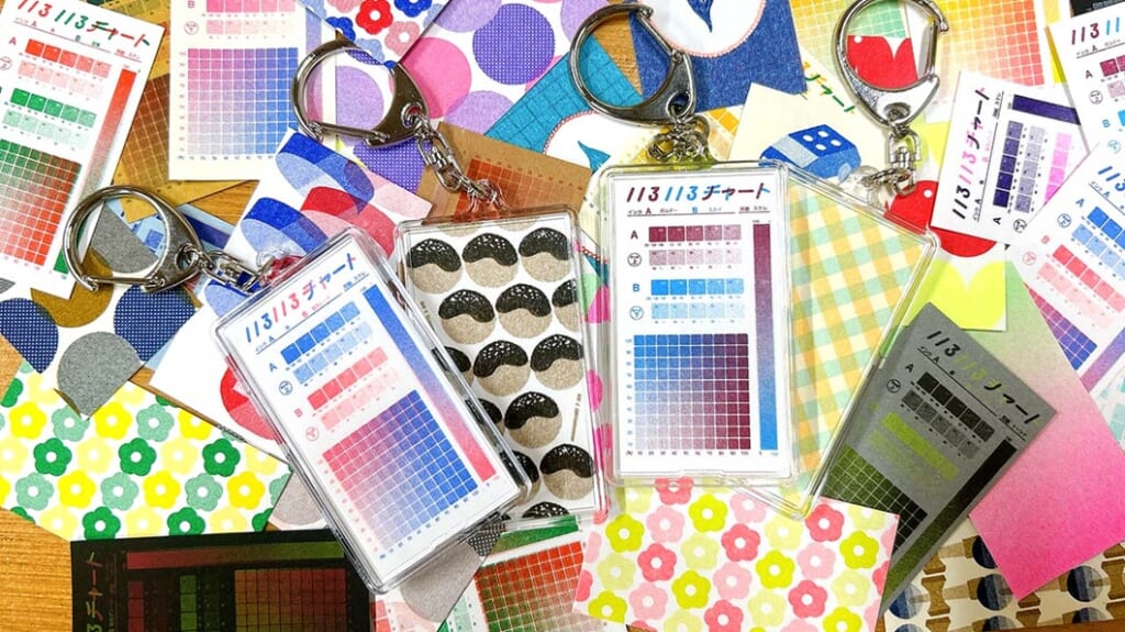 紙とインクを選んで、自分だけの2色のカラーチャートが作れるレトロ印刷のサービス【いろいろチャート】が手のひらサイズになって登場!好きな色の組み合わせを選んで、自分だけのいろいろチャートキーホルダーをお持ち帰りいただけます。