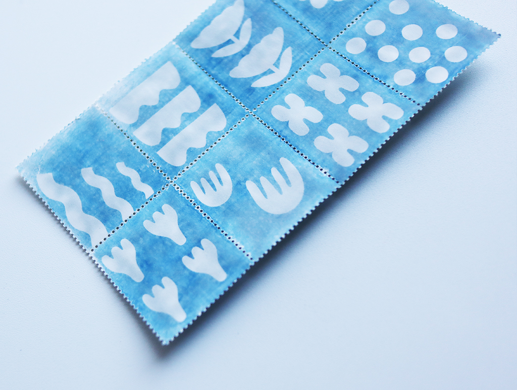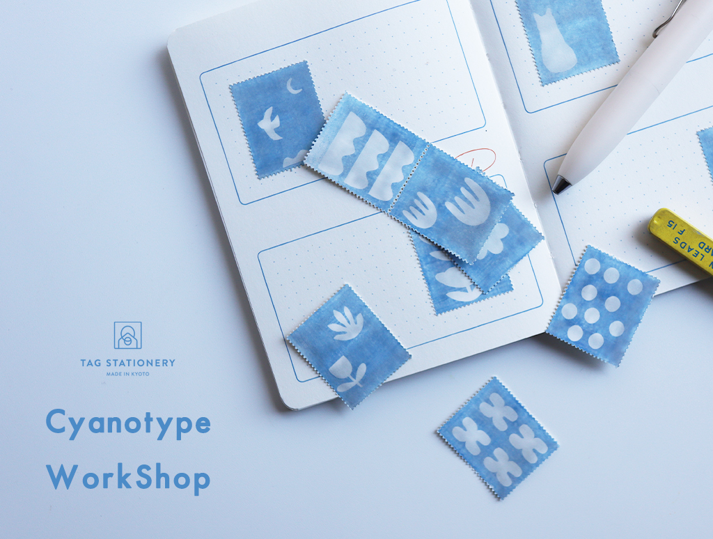 太陽の光で写し取る、青の世界。サイアノタイプ(日光写真)の技法を使って、無地の切手シールを自分だけのオリジナルシールに仕上げるワークショップです。