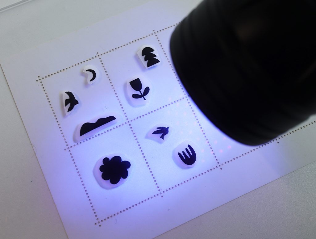 コラージュ用の素材をご用意していますので、その場で自由に組み合わせてもOK。お気に入りのイラストや写真など、持ち込み素材の使用も大歓迎です。感光液を塗ったシールにモチーフをのせて、太陽に当てると、少しずつ浮かび上がる深いブルーの像。現像の瞬間まで、どんな仕上がりになるかはお楽しみ。