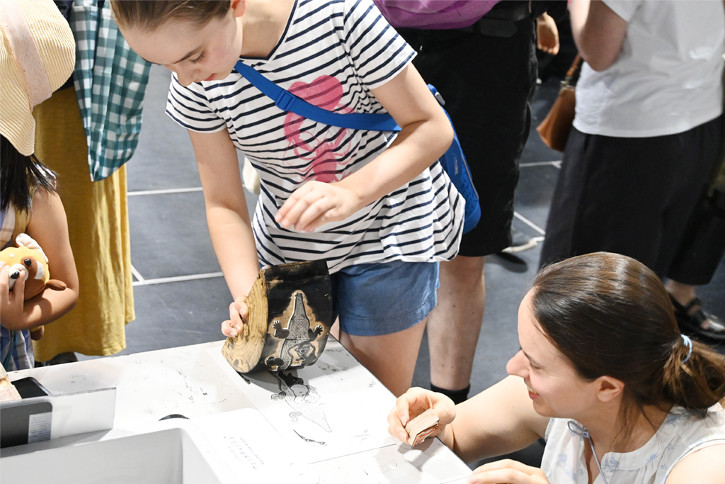 大きな「ゴロゴロスタンプ」をはじめ、大嶋奈都子が制作したさまざまなスタンプを、自由に押して楽しめるワークショップです。紙は、企業様からご提供いただいた端切れをご用意しています。