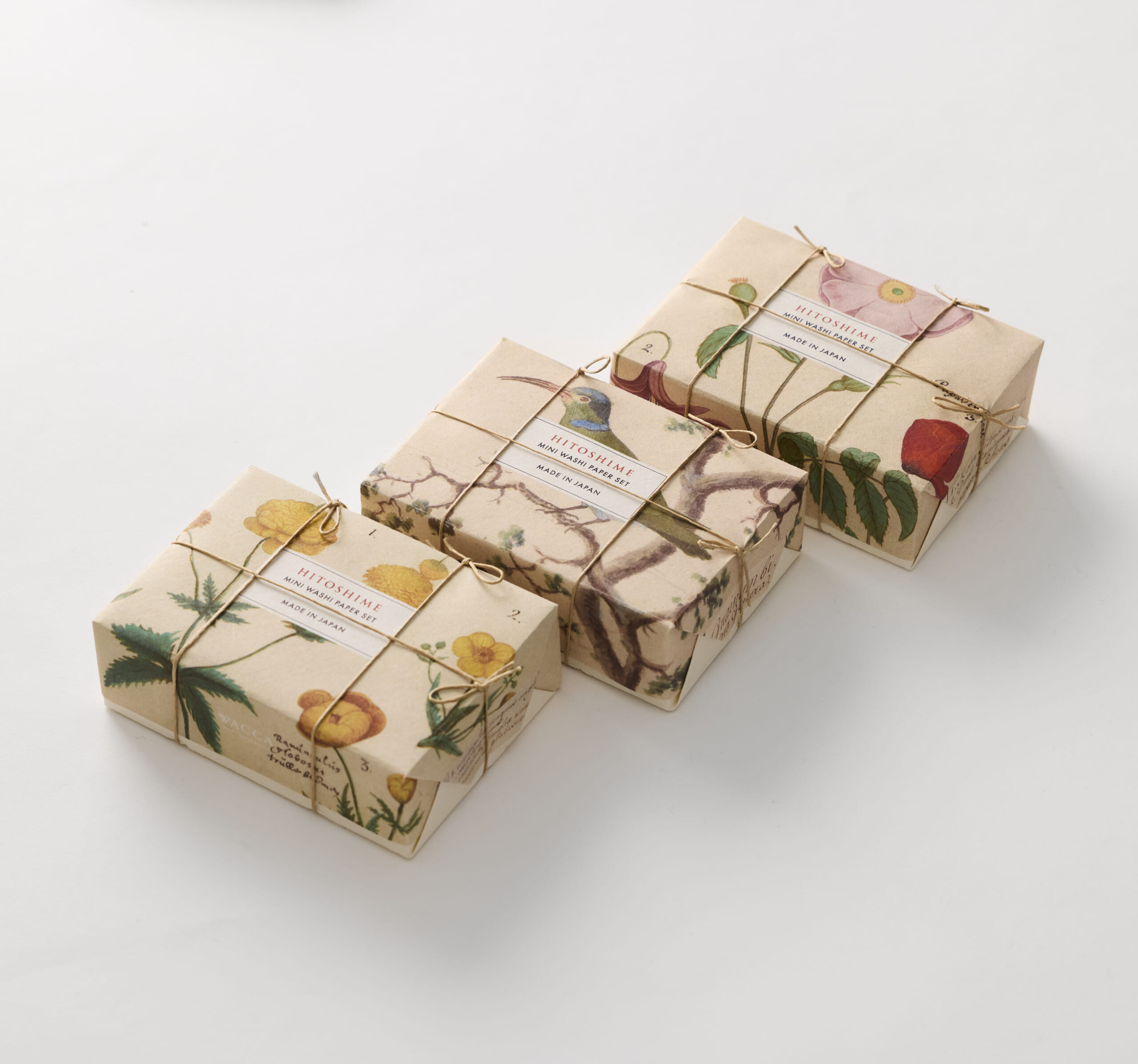 お好きな和紙の束4つを選んでいただき、お好みのかけ紙でお包みしてお渡しする、紙博恒例の「MYひとしめ」。このミニサイズのひとしめは、半紙の約1/8スケール。手帳レフィルのM6(ミニ6穴)に近いサイズで、メモや小さな一筆箋、ジャーナルのコラージュ素材などに使いやすい寸法です。2026年はオランダの古い植物画をテーマにしたかけ紙で展開していきます。